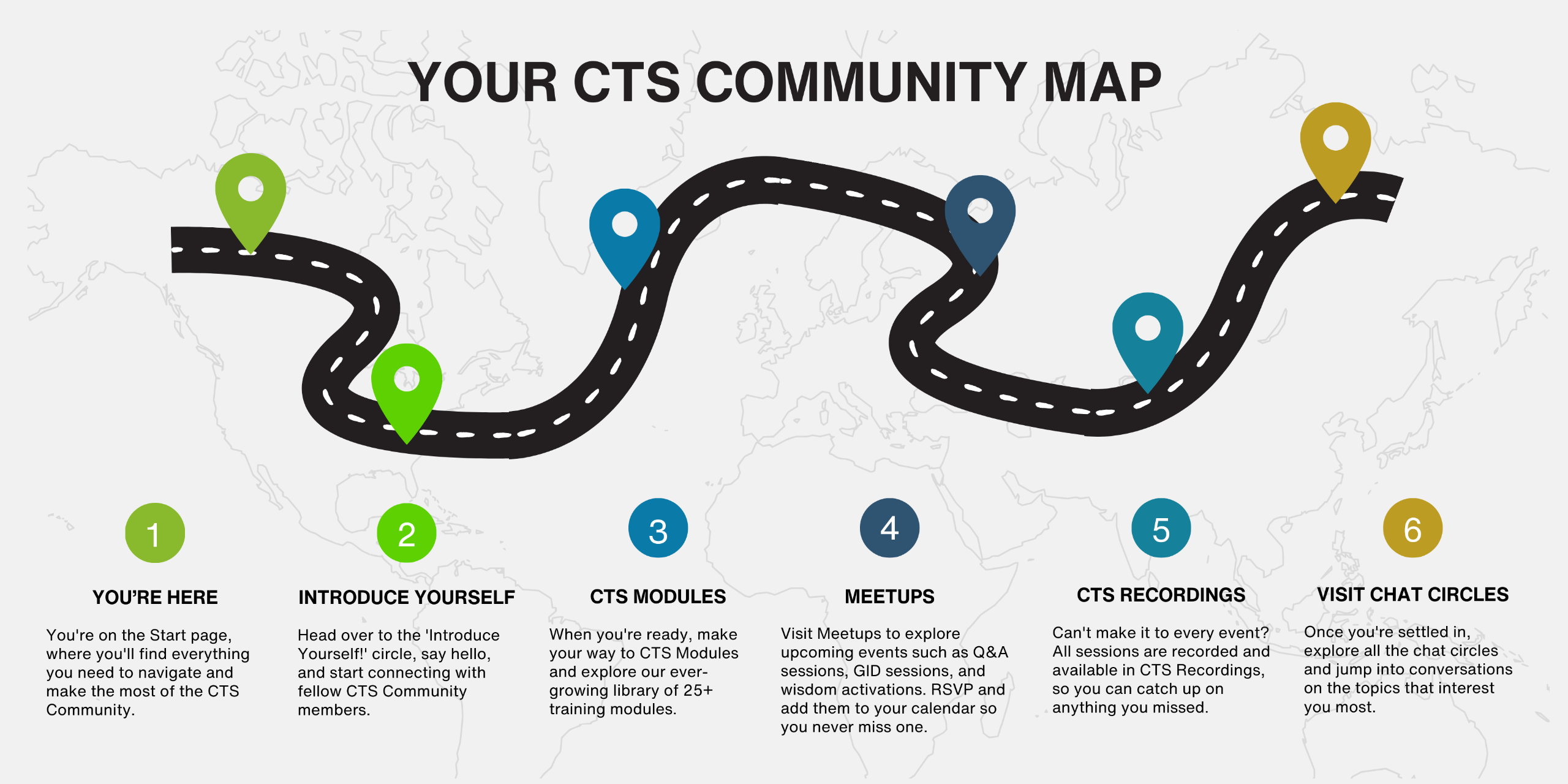 - Panel on left-hand side: This is where everything lives, including your access to CTS Modules (for 25+ trainings, templates, downloads), the CTS Library (for past event recordings), and CTS Recordings (for the replays from our classes)!